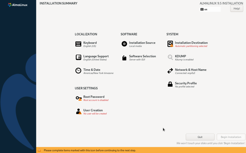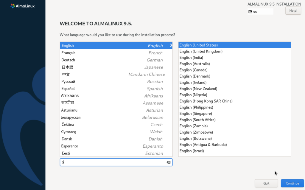 ダウンロードしたイメージを使ってコンピューターを起動すると AlmaLinux 9 のインストーラーが起動し、以下の画面が表示されます。