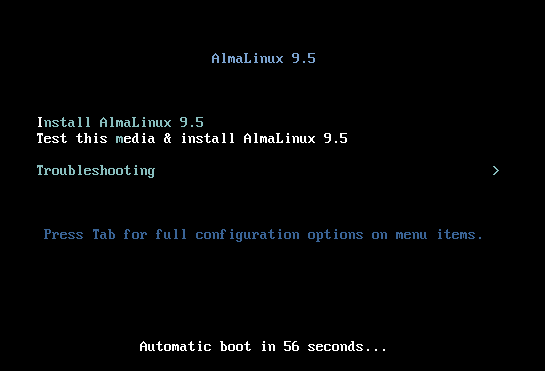 インストールするには [Install AlmaLinux 9.x] を選択して Enter キーを押下します。